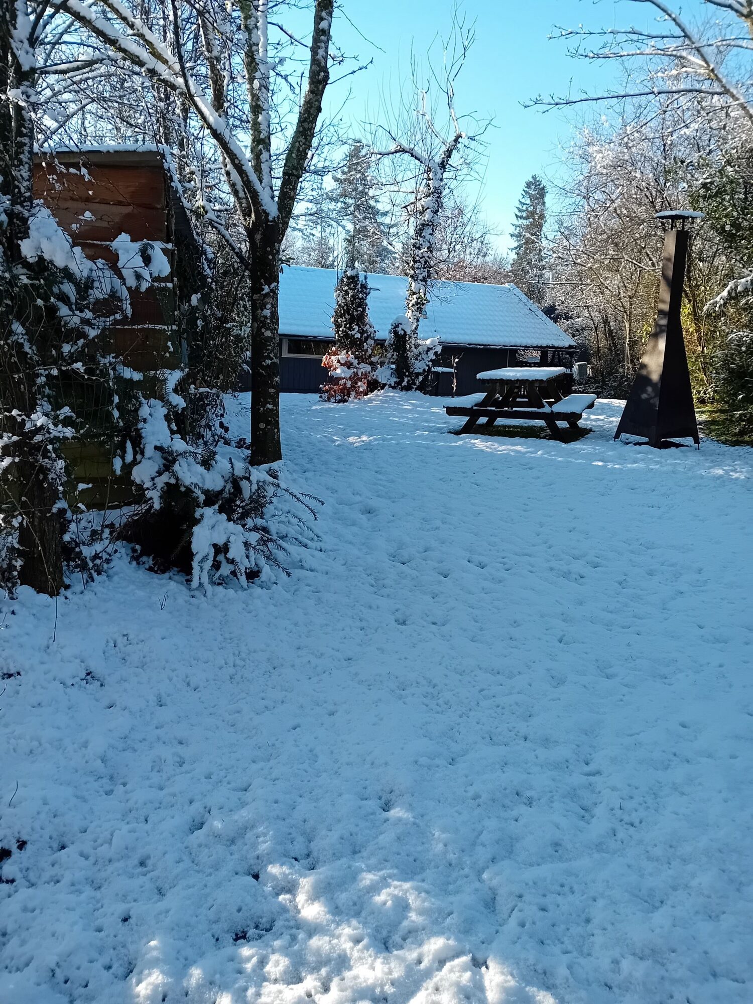 Het chalet heeft een grote prive omheinde tuin van zo’n 750 m2 groot. De tuin biedt veel privacy doordat de chalets een rustige ligging hebben naast een bosrand. In de schuur bevindt zich het tuinmeubilair, een hangmat, buitenkachel en een barbecue. Hout voor de buitenkachel en de houtkachel kunt u bij de supermarkt of bij de plaatselijke benzinepomp kopen.