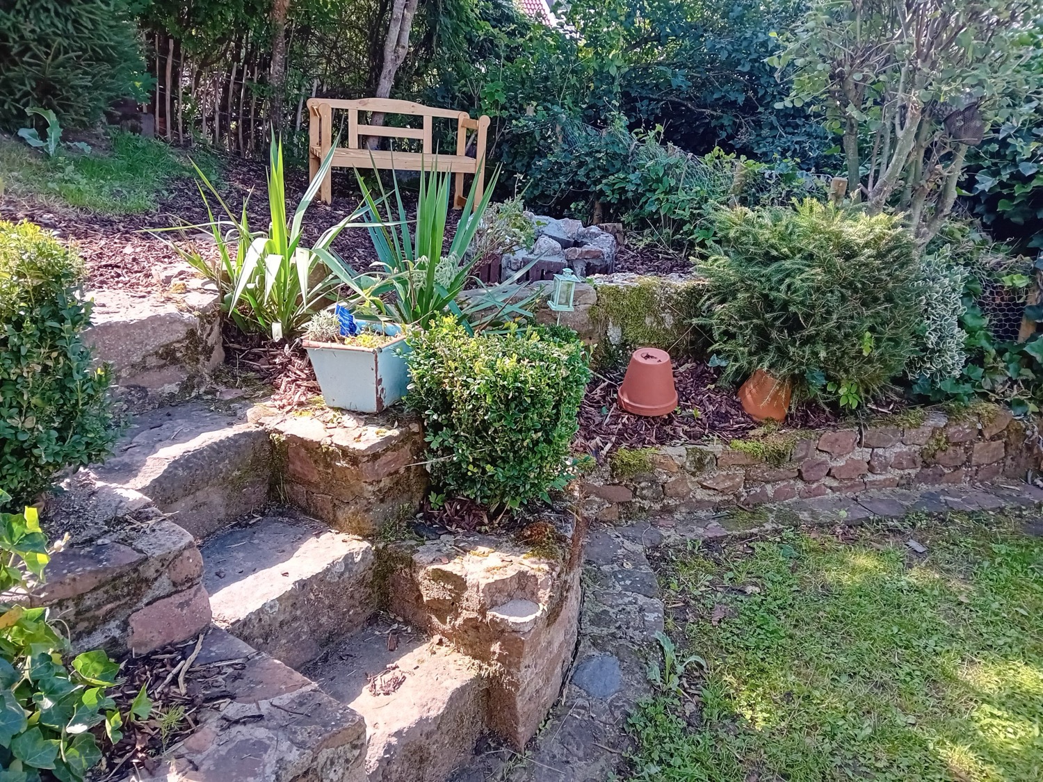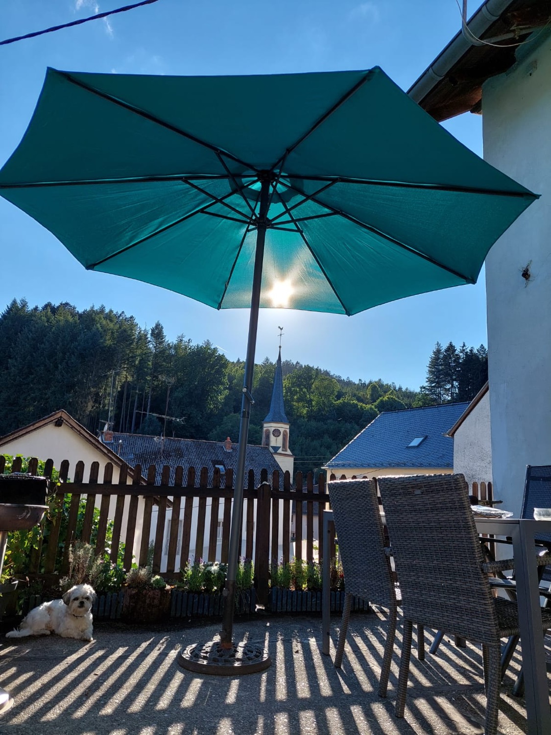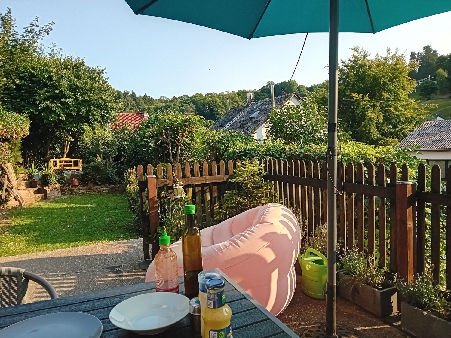 - zonnige tuin met terras op het zuiden met tuinmeubels en parasol