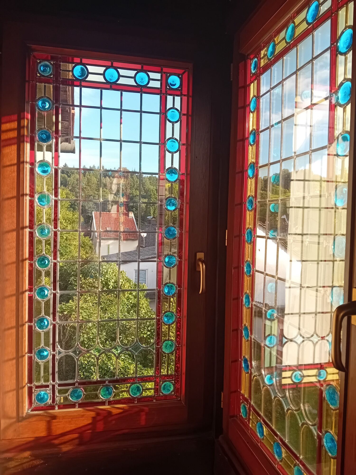 Sfeervolle woonkamer (34m2) met ‘glas in lood erker’, eethoek en houtkachel