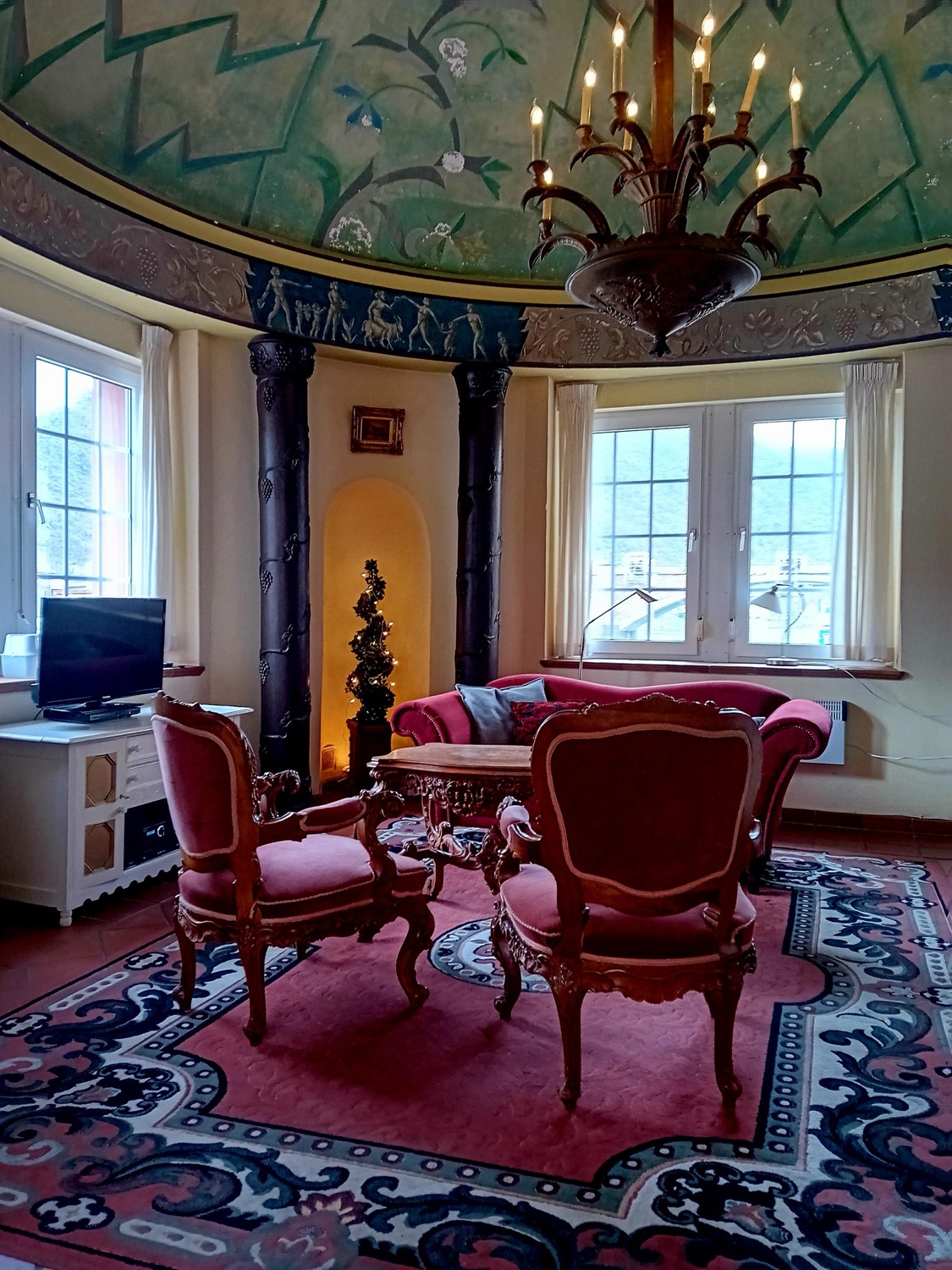 Het betreft een huis dat in 1903 door de toenmalige Graf von Zinderfeld is gebouwd als tuinpaviljoen bij zijn Jachtkasteel, omdat hij een mooi uitzicht op de Moezel wenste en daarnaast ongestoord gasten wilde ontvangen. Het jachtkasteel bestaat niet meer, maar het tuinpaviljoen is in 2001 in zijn oude glorie hersteld en onder monumentenzorg gesteld. Het huis is geheel (net als het toenmalige kasteel) gebouwd in “jugendstil’. Als u het huis betreedt waant u zich even in een museum: een prachtig koepelplafond met handgeschilderde taferelen, ronde zuilen langs de cirkelvormige woonkamer en talrijke andere prachtige details. Het huis is modern/klassiek ingericht met onder meer een moderne inbouwkeuken. Het uitzicht op de Moezel, de jachthaven voor het huis en de wijnheuvels is ronduit prachtig.